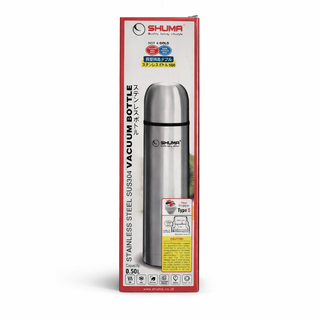 SHUMA Stainless Steel Vacuum Bottle 500ml adalah botol minum berbahan stainless steel SUS304 dengan teknologi vacuum insulation yang mampu menjaga suhu minuman tetap panas maupun dingin lebih lama. Desainnya elegan, kuat, dan praktis dibawa untuk aktivitas sehari-hari seperti kerja, sekolah, maupun traveling. Dengan kapasitas 500 ml, botol ini nyaman digunakan dan dilengkapi tutup yang aman serta mudah dibuka. ☕❄️